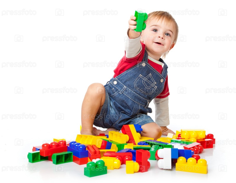 Мальчик играет с конструктором, изолирован на белом фоне