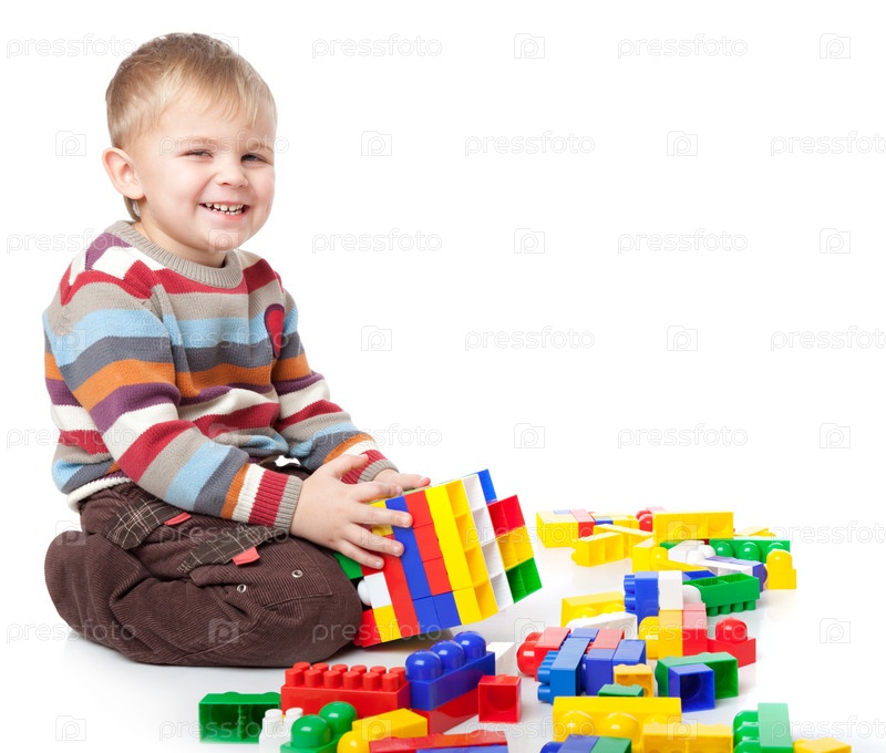 Мальчик играет с конструктором, изолирован на белом фоне