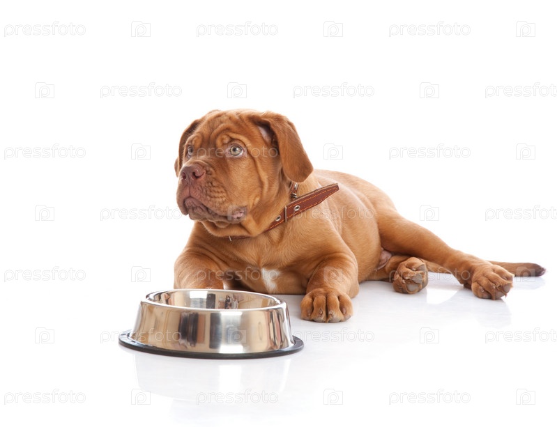 Голодная собака лежит рядом с миской, изолирована на белом фоне