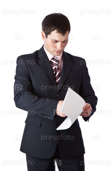Бизнесмен изучает документ, изолирован на белом фоне