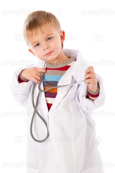 Миленький мальчик изображает врача, изолирован на белом фоне