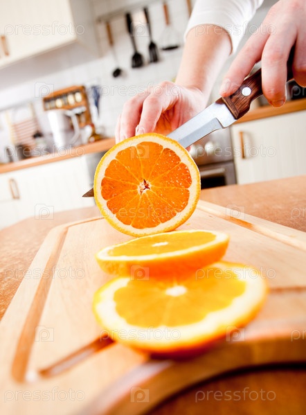 Женщина режет апельсин на кухне