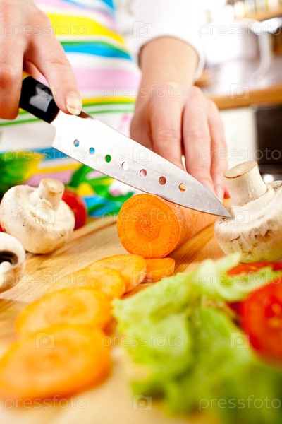 Женщина режет овощи на кухне