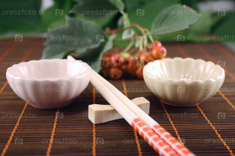 Палочки с двумя кубками для питья на бамбуковой салфетке