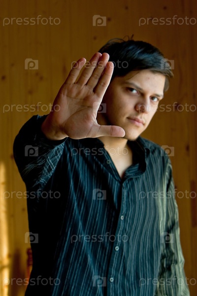 Молодой человек с поднятой рукой, показывающий знак "стоп"