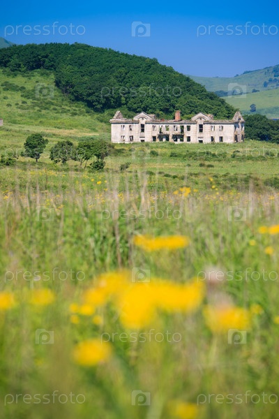 Заброшенное здание на фоне зеленого холма