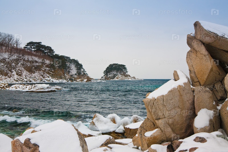 Скалистое морское побережье в снегу