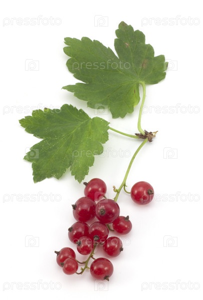 Веточка красной смородины с зелеными листьями на белом фоне