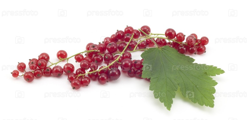 Красная смородина с зелеными листьями на белом фоне