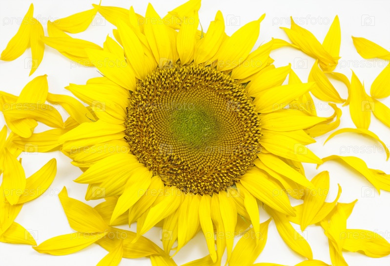Подсолнух с лепестками крупным планом на белом фоне
