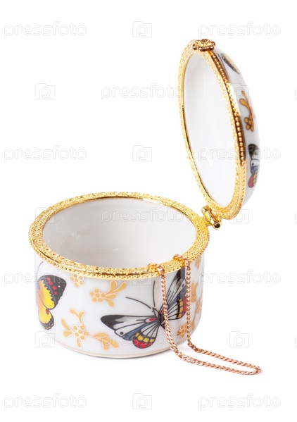 Белая фарфоровая коробочка с золотой цепочкой на белом фоне