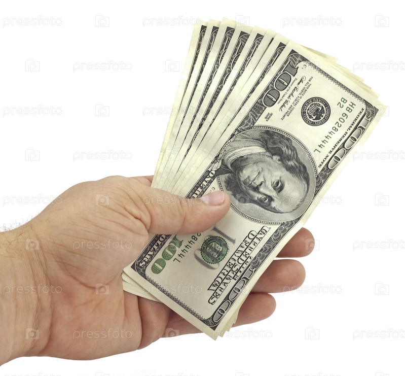 Стодолларовые купюры в руке на белом фоне