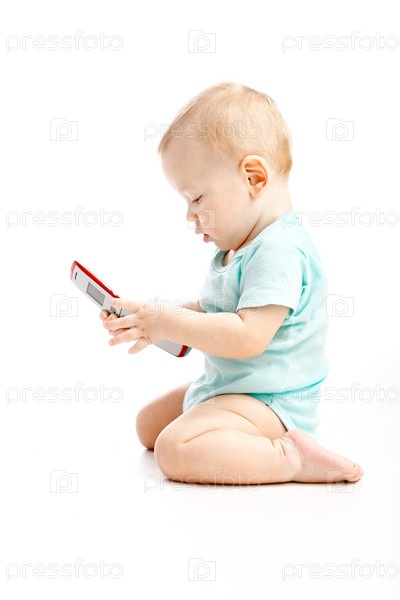 Милый ребенок разговаривает на сотовом телефоне, изолированный над белым