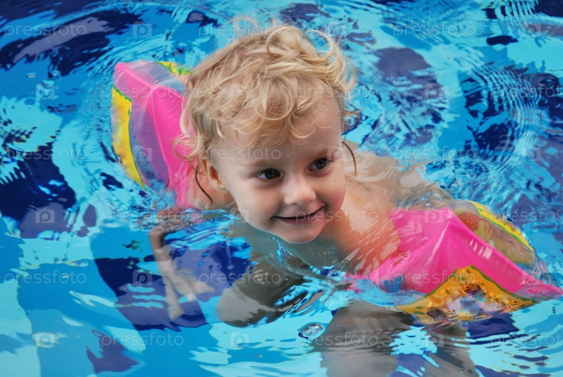 Маленькая девочка с надувными рукавами плавает в бассейне