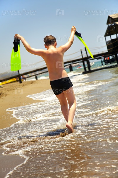 Мальчик идет вдоль берега с ластами в руках
