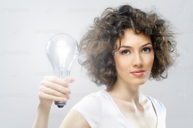 Красивая женщина с большой лампочкой в руке