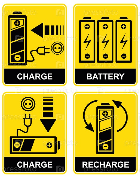 Набор векторных значков - зарядка и перезарядка батареи аккумулятора. жёлтый и черный. пиктограммы