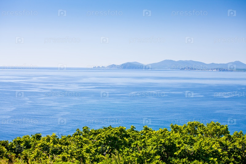 Зеленые кусты на берегу синего моря