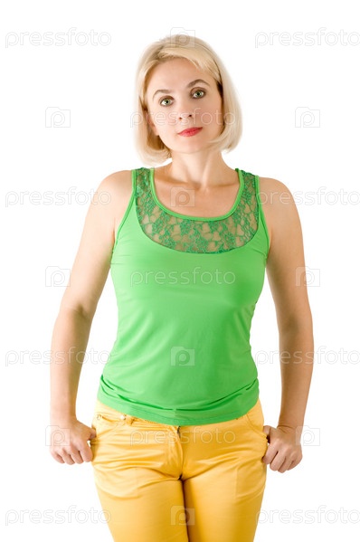 Красивая женщина в зеленой футболке и желтых брюках