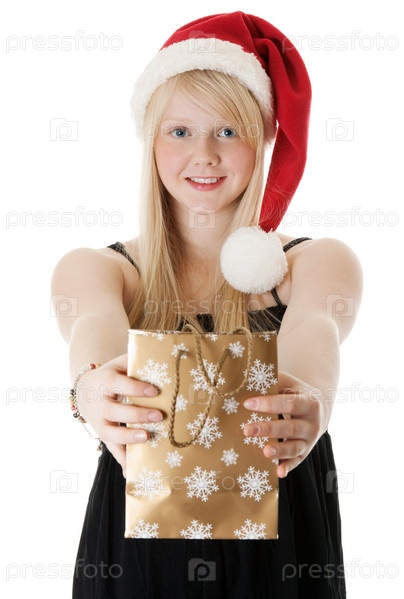 Молодая девушка в колпаке с новогодним подарком