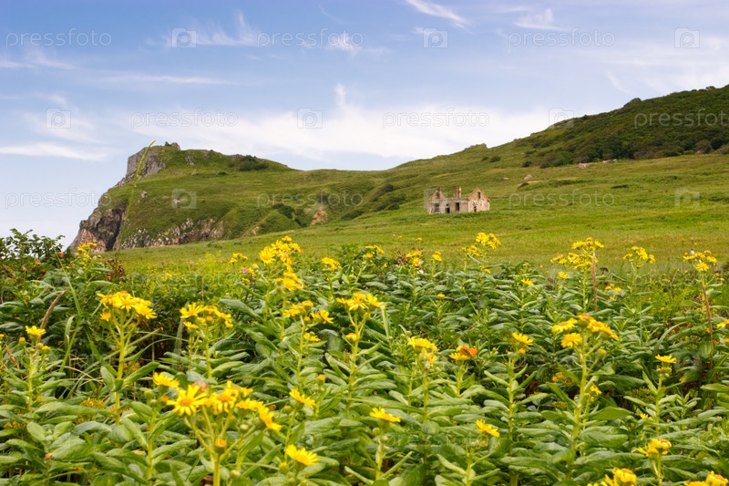 Горный зеленый луг с желтыми цветами на переднем плане