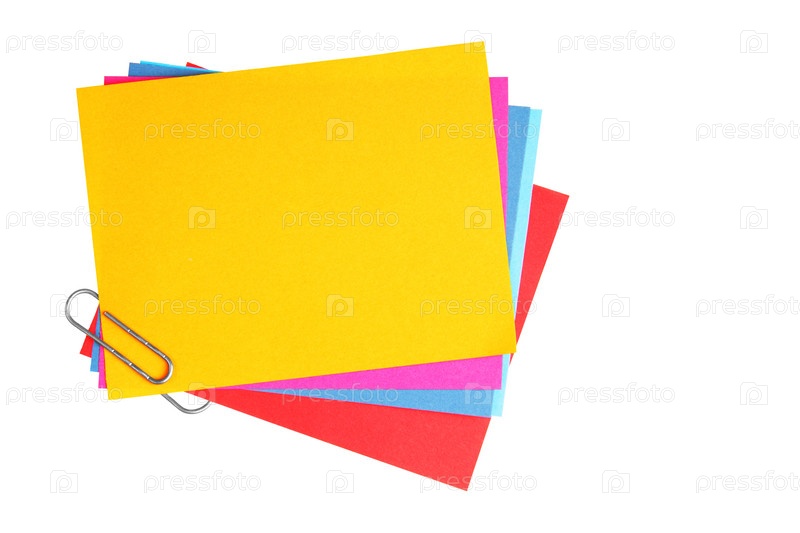 Разноцветные листки со скрепкой на белом фоне