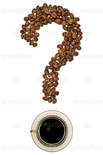 Вопросительный знак из кофейных зерен и чашки кофе на белом фоне
