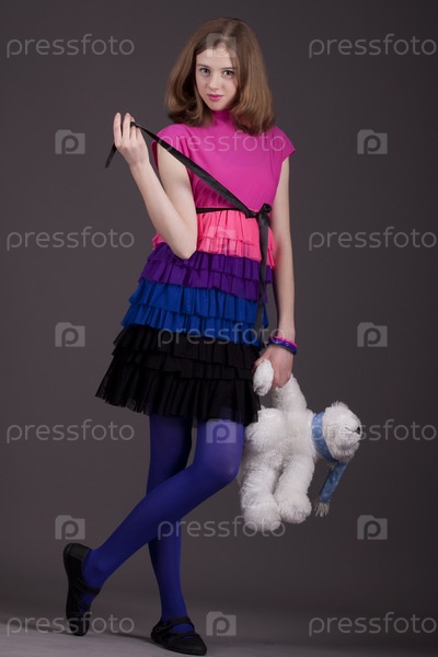 Светловолосая девушка с мягкой игрушкой в руке на сером фоне