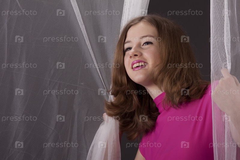 Светловолосая девушка на сером фоне с прозрачной шторой