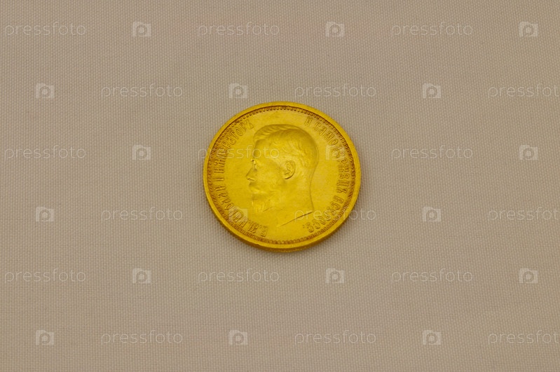 Монета из желтого металла с профилем Николая II на сером фоне