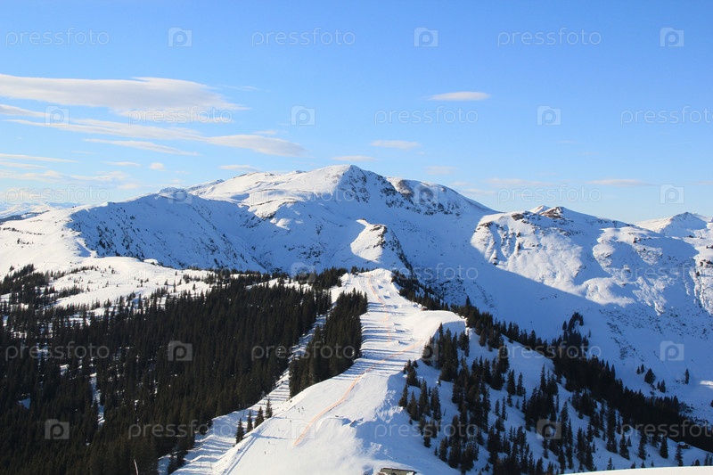 Панорамный вид на снежные горы и лесной массив