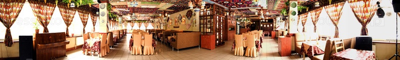 Роскошный зал ресторана в азиатском стиле, панорамный вид