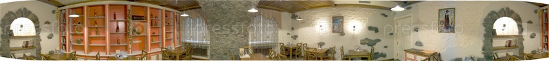 Роскошный зал ресторана в средневековом стиле, панорамный вид