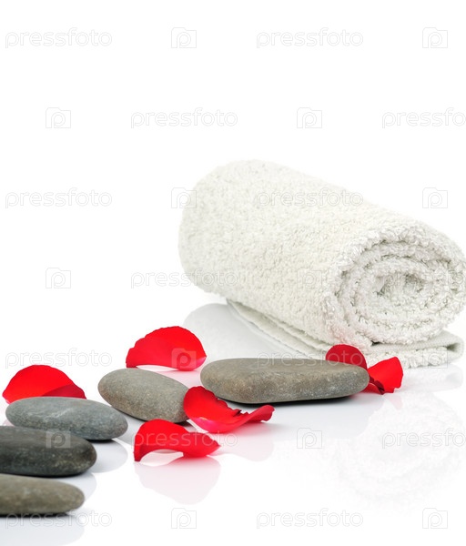 Полотенце, галька и лепестки роз на белом фоне