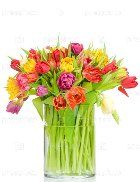Разноцветные тюльпаны стоят в стеклянной посуде