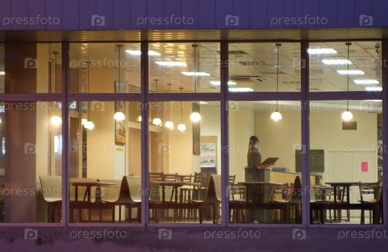 Девушка в освещенном окне круглосуточного кафе