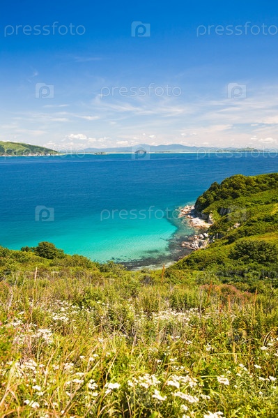 Травянистый берег и тонкая полоска пляжа на морском побережье