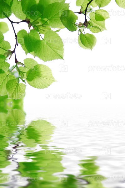 Абстрактное изображение с зелеными листьями на белом фоне и водной поверхностью