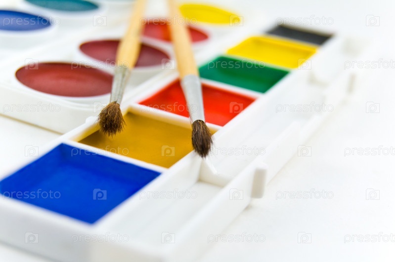 Краски и кисточки на белом фоне