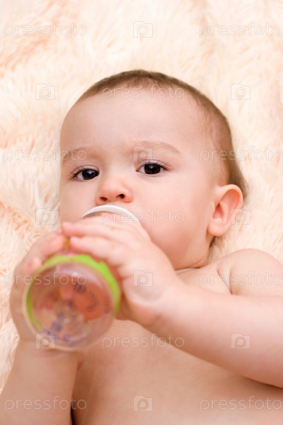 Маленький мальчик пьет из бутылочки