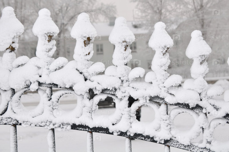 Кованый железный забор в парке зимой
