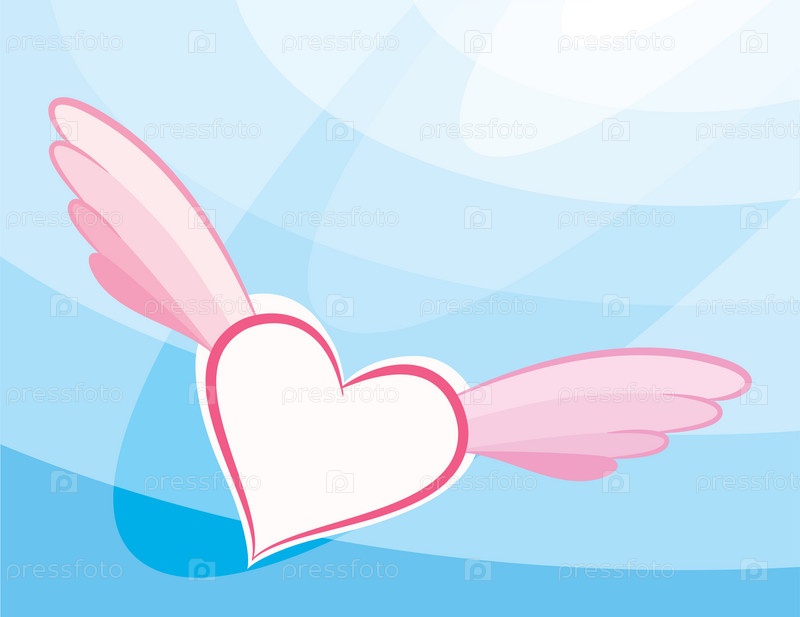 Розовое сердце с крыльями на голубом фоне