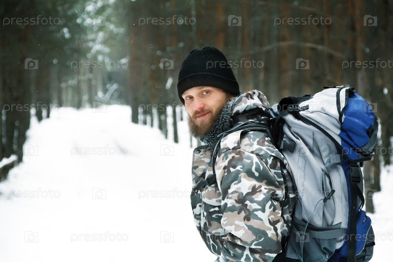 Путешественник в камуфляжной куртке с рюкзаком в зимнем лесу