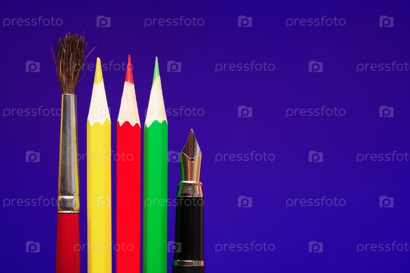 Кисть, цветные карандаши и перьевая ручка
