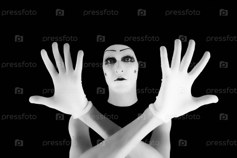 Портрет мима в белых перчатках на черном фоне