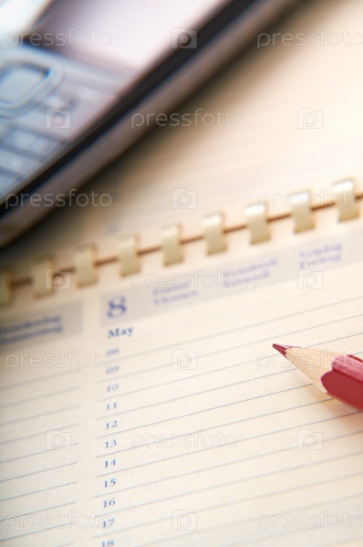 Карандаш и сотовый телефон, лежащие на открытом ежедневнике