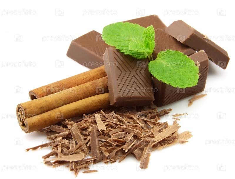 Шоколад, корица и мята на белом фоне