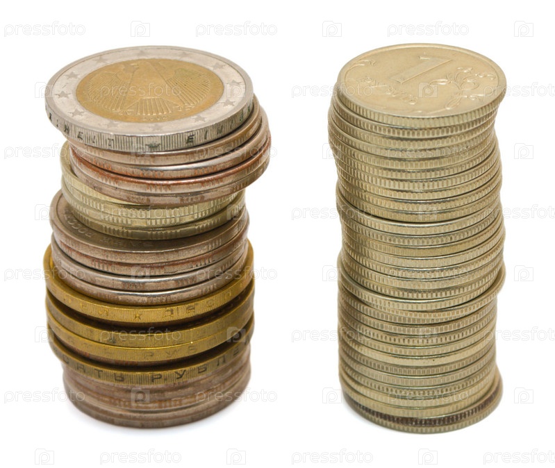 Две стопки монет на белом фоне