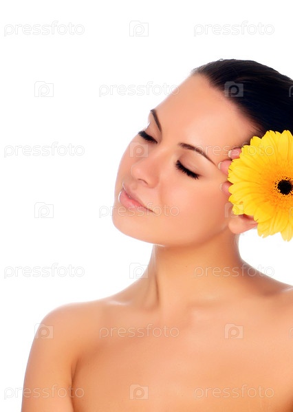 Портрет свежей и красивой женщины с цветом, изолированным на белом
