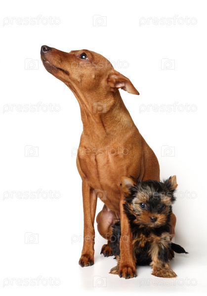 Миниатюрный пинчер и щенок йоркширского терьера на белом фоне